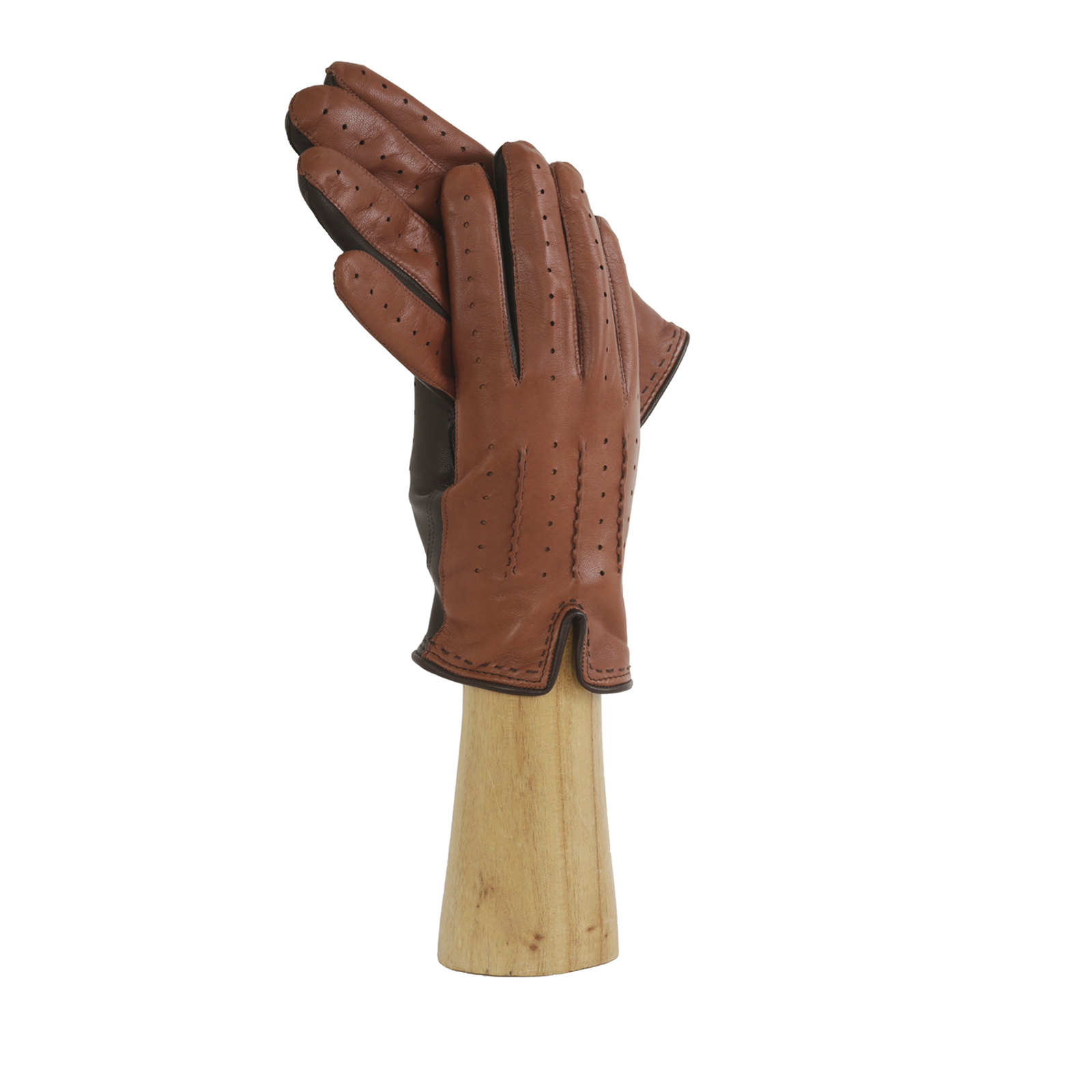 Two-tone fancy driving glove for men in silk lined lamb leather.